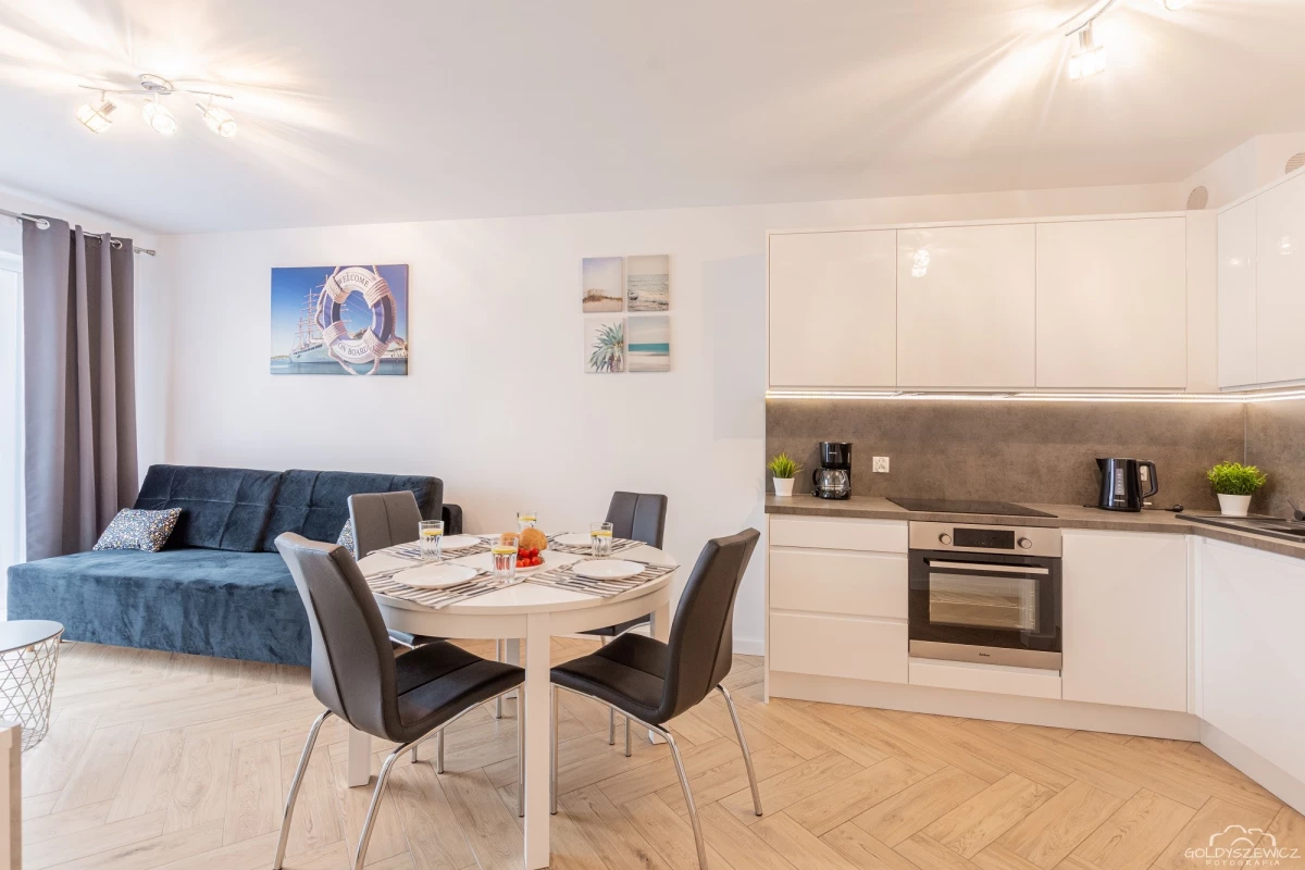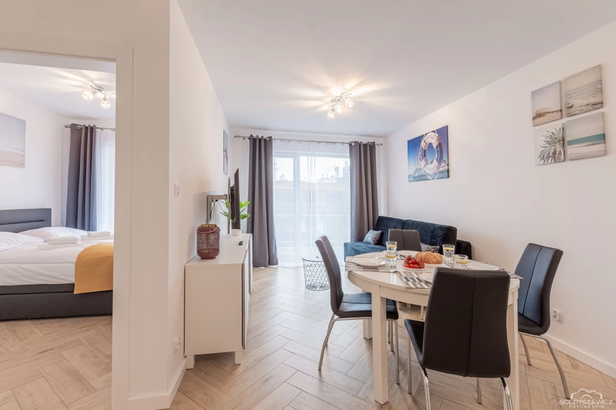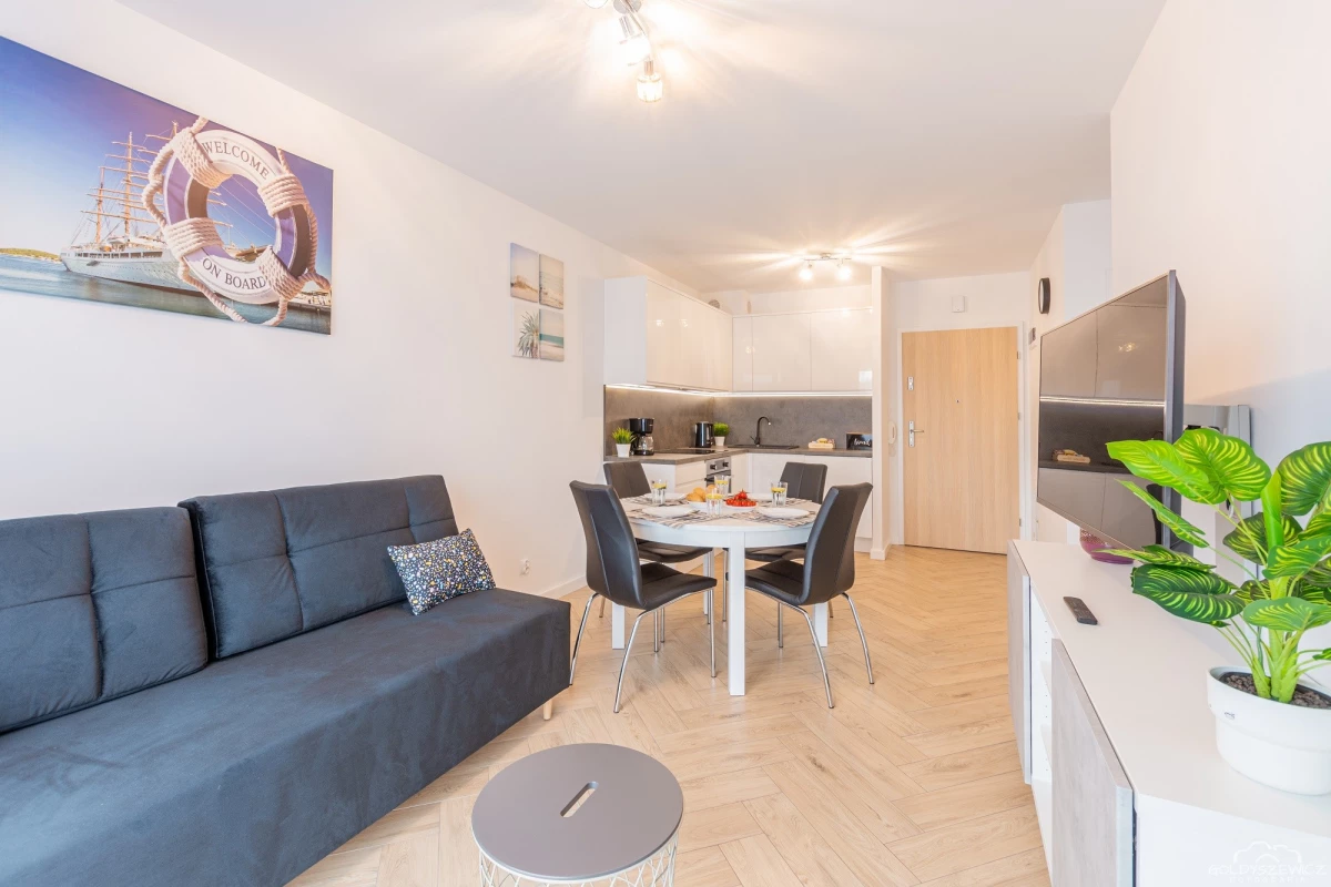 Stylowy apartament zlokalizowany na osiedlu Nawigator w Kołobrzegu przeznaczony jest dla maksymalnie 4 osób. Ma powierzchnię użytkową ok. 38m², apartament znajduje się na zamkniętym osiedlu Navigator, budynek posiada windę. Na apartament składają się jedna zamykana sypialnia z łóżkiem małżeńskim, salon z aneksem kuchennym (wyposażonym w zmywarkę, piekarnik, itd.) , balkon oraz łazienka z prysznicem i pralką. Jest również miejsce postojowe.