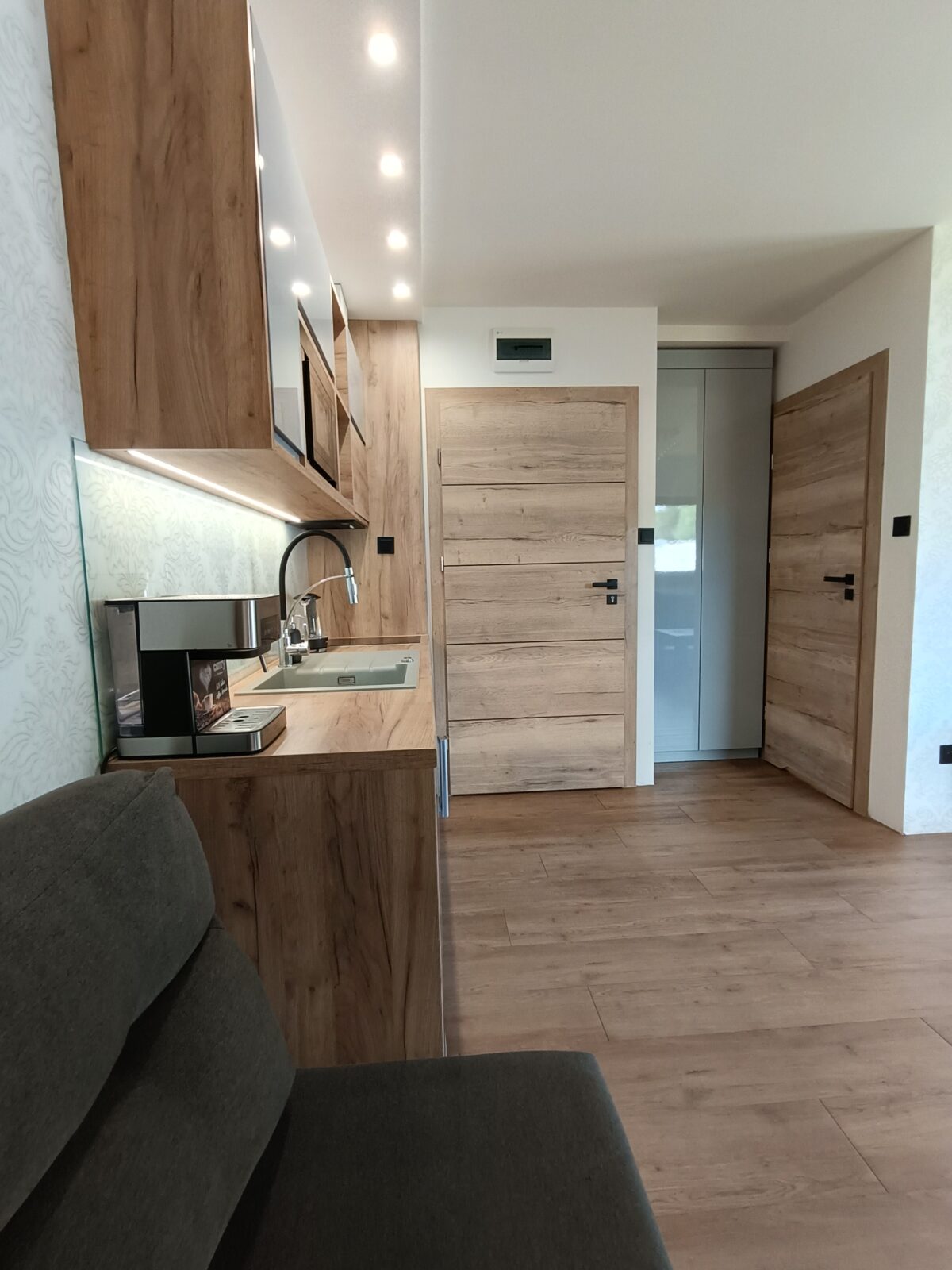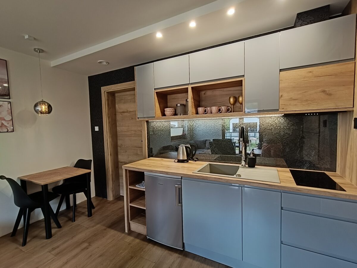 W pełni wyposażony aneks kuchenny: lodówka z zamrażarką, mikrofala, płyta ceramiczna, ekspres do kawy, czajnik elektryczny i pełna zastawa