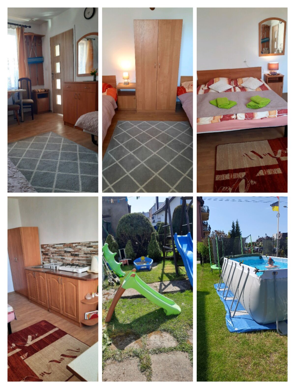 Domek znajduje się na ogrodzonej posesji z miejscem na samochód i placem zabaw z trampoliną dla dziecka, oraz basenem który pozwala się schłodzić w upalne dni..