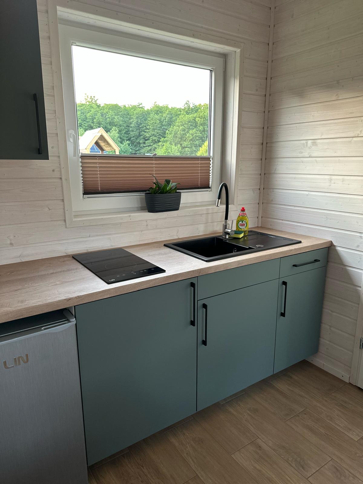 W pełni wyposażona kuchnia z nowoczesnym sprzętem AGD (lodówka, płyta indukcyjna, czajnik elektryczny) umożliwia wygodne przygotowanie posiłków. Obok znajduje się jadalnia z okrągłym stołem.