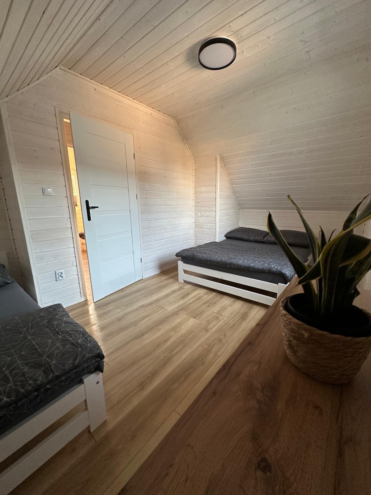 Każdy domek posiada dwie oddzielne sypialnie (jedna z wyjściem na balkon) – a w każdej z nich łóżko podwójne oraz łóżko pojedyncze. Wygodne materace, cicha okolica zapewniają idealne warunki do wypoczynku.